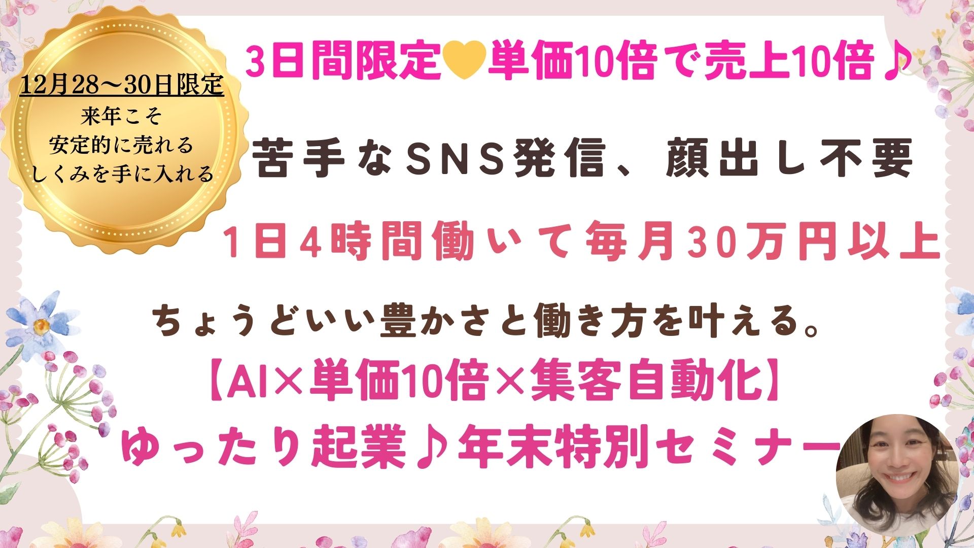 そこで、年末年始の忙しい時期でも真剣にビジネスと向き合い、より豊かに楽しい人生にしたい!と行動できる方だけに