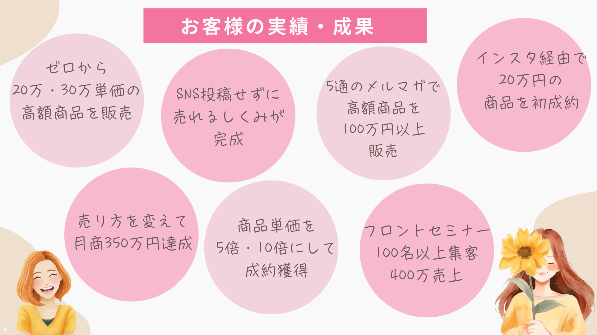 今「どこを見て何をしてすればいいか」を理解しながら進められるように完全マニュアル化していて、実践した方は知識実績ゼロから取り組んで20万円以上の商品を初成約されたり、広告を使って集客を自動化されたり、最高月商を達成するなど成果を出されています。