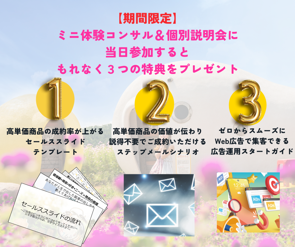 なお、今だけ少人数限定でご案内している無料のお試しミニコンサルも、今回の個別説明会では受けていただけます。